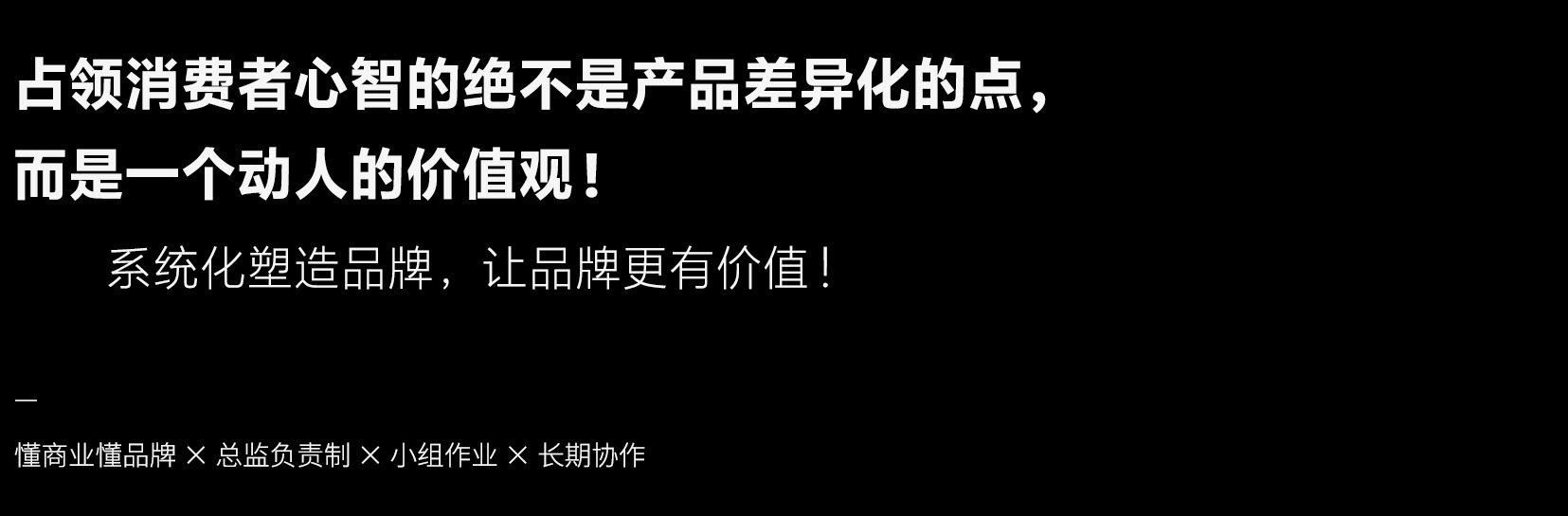 品牌建设是一项系统的工程,它由一系列的符号组合而成,积累品牌价值, 构成一套品牌的资产。它是品牌文化和理念的表达,市场和消费者以品牌来思考和接受,最终达成认同。品牌整体解决方案不仅仅代表服务内容,更意味着整体思维和系统思考!品牌系统工程中的任何环 节单独提取,都必须回归到品牌整体建设的最终目的,让各项专业技术服务于品牌营销目的。